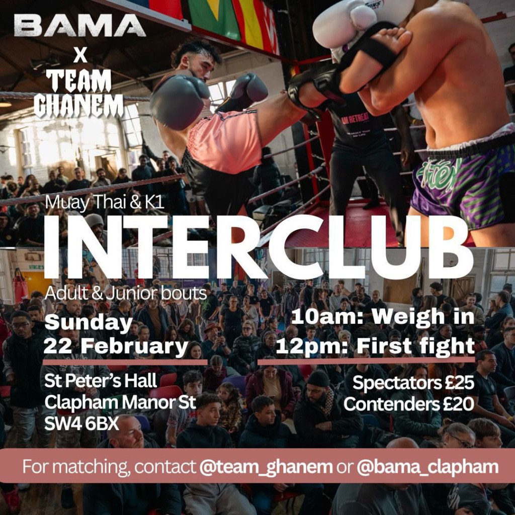 BAMA Clapham are teaming up with Team Ghanem to make this Interclub truly special. This guarantees a wide range of fighters allowing for better matchmaking and better fights.